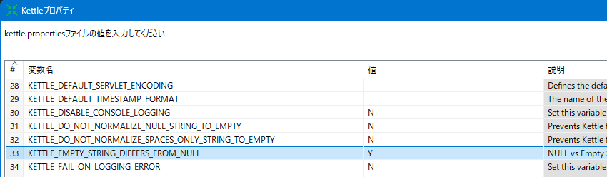 デフォルト状態(オプション KETTLE_EMPTY_STRING_DIFFERS_FROM_NULL=N )で実行。