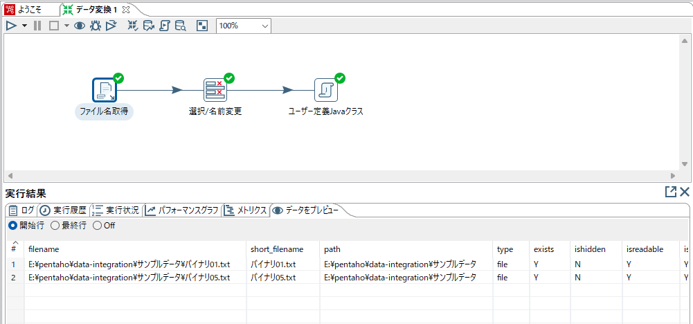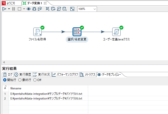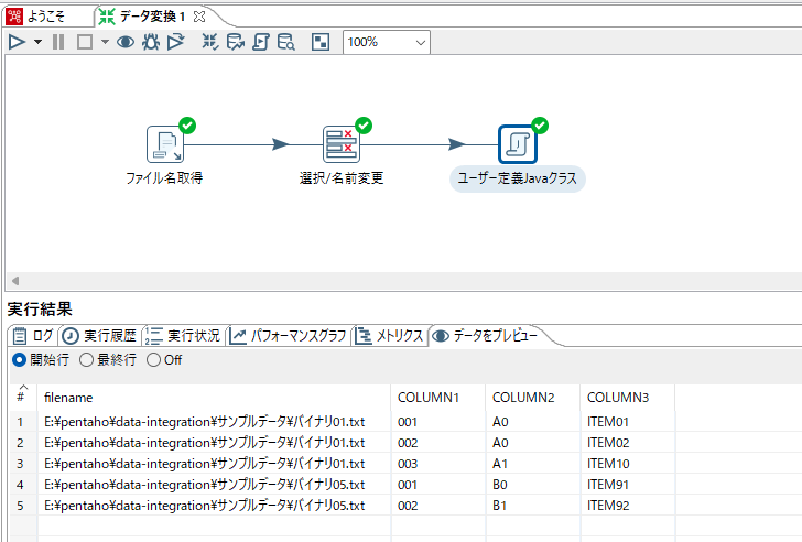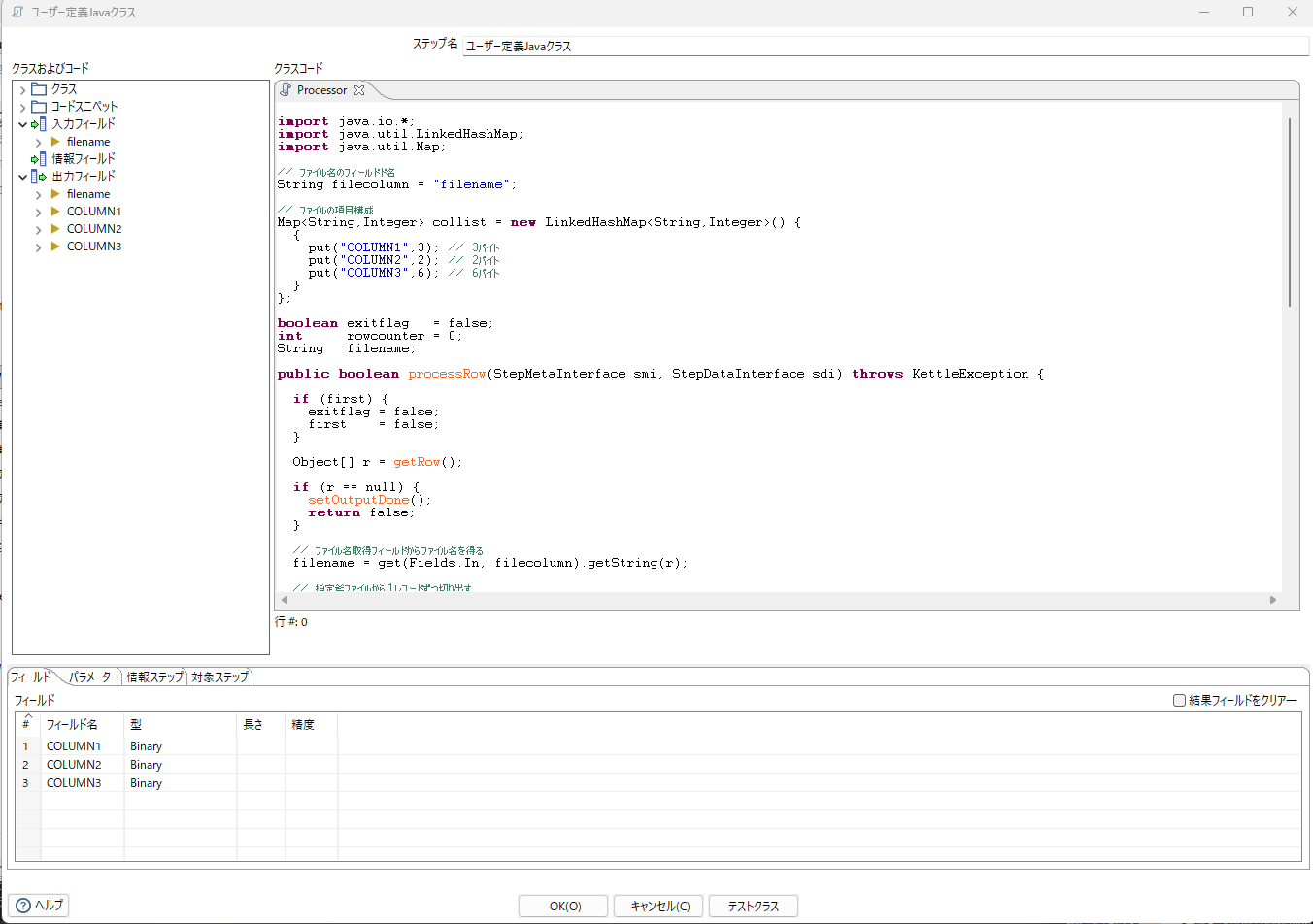 import java.io.*; import java.util.LinkedHashMap; import java.util.Map; // ファイル名のフィールドド名 String filecolumn = "filename"; // ファイルの項目構成 Map<String,Integer> collist = new LinkedHashMap<String,Integer>() { { put("COLUMN1",3); // 3バイト put("COLUMN2",2); // 2バイト put("COLUMN3",6); // 6バイト } }; boolean exitflag = false; int rowcounter = 0; String filename; public boolean processRow(StepMetaInterface smi, StepDataInterface sdi) throws KettleException { if (first) { exitflag = false; first = false; } Object[] r = getRow(); if (r == null) { setOutputDone(); return false; } // ファイル名取得フィールドからファイル名を得る filename = get(Fields.In, filecolumn).getString(r); // 指定斧ファイルから1レコードずつ切り出す try { InputStream input = new FileInputStream(filename); while(!exitflag) { rowcounter++; byte[] buffer; boolean safe = true; Object[] rec = createOutputRow(r, data.outputRowMeta.size()); // レコードのデータを設定 for(Map.Entry<String,Integer> item : collist.entrySet()) { int len = 0 + ((Integer)item.getValue()); try { buffer = input.readNBytes(len); } catch(IOException e) { input.close(); logError(String.format("rec %d : %s", rowcounter, e.getMessage()) ); setOutputDone(); return false; } if ((buffer.length <= 0)||(buffer.length < len)) { exitflag = true; safe = false; break; } // 項目をレコードのひな型に格納していく get(Fields.Out, ((String)item.getKey())).setValue(rec, buffer); } // 1レコード分読み取れたらレコードを書き出す if (safe) putRow(data.outputRowMeta, rec); } // 次レコードの準備 input.close(); rowcounter = 0; exitflag = false; } catch (IOException e) { logError(String.format("rec %d : %s", rowcounter, e.getMessage()) ); setOutputDone(); return false; } return true; }