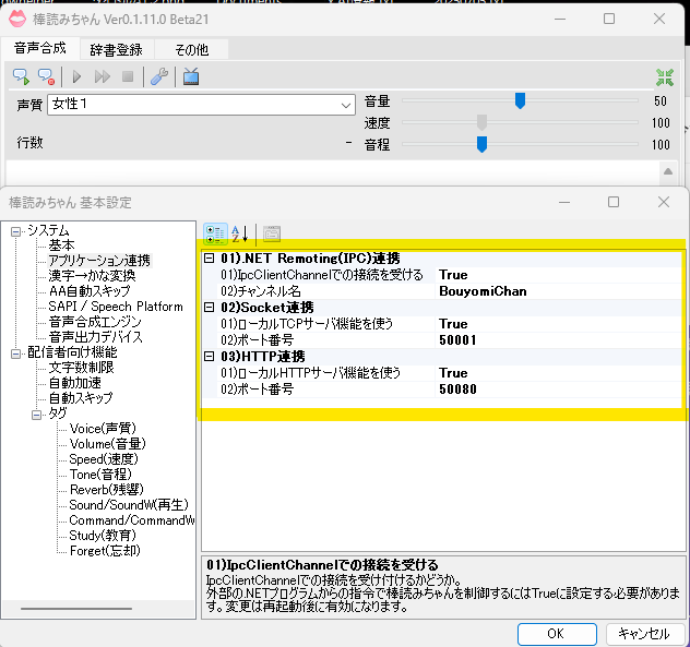 棒読みちゃんIPC接続 BouyomiChan/Remoting | 棒読みちゃんの IpcClientChannel接続を模しています。連携ソフトウエアがIPCを利用する場合はここを有効にします。 |