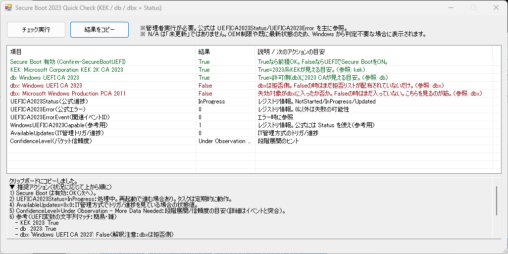 #requires -version 5.1 # SecureBoot-Check.ps1 # GUIで KEK/db/dbx と、公式レジストリ進捗(UEFICA2023Status等)を表示し、 # 結果に応じた推奨アクション(分岐ロジック)を下部に出す。 # PS2EXEで -noConsole -requireAdmin を付けてEXE化する想定。 Set-StrictMode -Version Latest $ErrorActionPreference = 'Stop' Add-Type -AssemblyName System.Windows.Forms | Out-Null Add-Type -AssemblyName System.Drawing | Out-Null # ------------------------ # 権限チェック(要件どおり:警告して終了) # ------------------------ function Assert-AdminOrExit { $id = [Security.Principal.WindowsIdentity]::GetCurrent() $p = New-Object Security.Principal.WindowsPrincipal($id) if (-not $p.IsInRole([Security.Principal.WindowsBuiltInRole]::Administrator)) { [System.Windows.Forms.MessageBox]::Show( "管理者として実行してください(右クリック → 管理者として実行)。", "Secure Boot 2023 Check", [System.Windows.Forms.MessageBoxButtons]::OK, [System.Windows.Forms.MessageBoxIcon]::Warning ) | Out-Null exit 1 } } # ------------------------ # PowerShell標準チェック # ------------------------ function Try-ConfirmSecureBoot { try { return Confirm-SecureBootUEFI } catch { return $null } } function Test-ByteSubsequence { param( [Parameter(Mandatory)][byte[]]$Haystack, [Parameter(Mandatory)][byte[]]$Needle ) if ($Needle.Length -eq 0) { return $true } if ($Haystack.Length -lt $Needle.Length) { return $false } for ($i = 0; $i -le $Haystack.Length - $Needle.Length; $i++) { $ok = $true for ($j = 0; $j -lt $Needle.Length; $j++) { if ($Haystack[$i + $j] -ne $Needle[$j]) { $ok = $false; break } } if ($ok) { return $true } } return $false } function Try-UefiVarMatch { param( [Parameter(Mandatory)][string[]]$Names, # 例: @('kek','KEKDefault') [Parameter(Mandatory)][string]$Needle ) function Test-ByteSubsequence { param([byte[]]$Haystack, [byte[]]$Needle) if ($Needle.Length -eq 0) { return $true } if ($Haystack.Length -lt $Needle.Length) { return $false } for ($i = 0; $i -le $Haystack.Length - $Needle.Length; $i++) { $ok = $true for ($j = 0; $j -lt $Needle.Length; $j++) { if ($Haystack[$i + $j] -ne $Needle[$j]) { $ok = $false; break } } if ($ok) { return $true } } return $false } $errs = @() $needleAscii = [System.Text.Encoding]::ASCII.GetBytes($Needle) $needleUtf16 = [System.Text.Encoding]::Unicode.GetBytes($Needle) # UTF-16LE foreach ($n in $Names) { try { # Get-SecureBootUEFI は UEFI変数を Bytes(byte[]) として返す $bytes = (Get-SecureBootUEFI -Name $n -ErrorAction Stop).Bytes $matched = (Test-ByteSubsequence $bytes $needleAscii) -or (Test-ByteSubsequence $bytes $needleUtf16) return [pscustomobject]@{ Readable = $true Matched = [bool]$matched Error = $null Source = $n } } catch { $errs += ($n + ": " + $_.Exception.Message) } } return [pscustomobject]@{ Readable = $false Matched = $null Error = ($errs -join " | ") Source = $null } } # ------------------------ # 公式レジストリ読み取り # ------------------------ function Try-GetRegValue { param( [Parameter(Mandatory)][string]$Path, [Parameter(Mandatory)][string]$Name ) try { $v = (Get-ItemProperty -Path $Path -Name $Name -ErrorAction Stop).$Name return [pscustomobject]@{ Readable = $true Value = $v Error = $null } } catch { return [pscustomobject]@{ Readable = $false Value = $null Error = $_.Exception.Message } } } function To-Hex([object]$v) { if ($null -eq $v) { return "" } try { $n = [uint32]$v return ("0x{0:X}" -f $n) } catch { return "$v" } } function ShortErr([string]$s) { if ([string]::IsNullOrEmpty($s)) { return $null } if ($s.Length -gt 160) { return $s.Substring(0,160) + "..." } return $s } function BoolText([bool]$b) { if ($b) { "True" } else { "False" } } # ------------------------ # UIヘルパ # ------------------------ function Set-RowBool { param( [System.Windows.Forms.ListViewItem]$Item, [object]$Value, # ← Nullableに拘らない [string]$Note, [string]$Err ) if ($null -eq $Value) { $Item.SubItems[1].Text = "N/A" $Item.ForeColor = [System.Drawing.Color]::Gray $se = ShortErr $Err if ($null -ne $se) { $Item.SubItems[2].Text = $Note + " / " + $se } else { $Item.SubItems[2].Text = $Note } return } # $Value は bool のことも Nullable[bool] のこともあるので、boolに寄せて評価 $b = [bool]$Value if ($b) { $Item.SubItems[1].Text = "True" $Item.ForeColor = [System.Drawing.Color]::DarkGreen } else { $Item.SubItems[1].Text = "False" $Item.ForeColor = [System.Drawing.Color]::DarkRed } $Item.SubItems[2].Text = $Note } function Set-RowText { param( [System.Windows.Forms.ListViewItem]$Item, [string]$ValueText, [string]$Note, [string]$Err ) if (-not [string]::IsNullOrEmpty($ValueText)) { $Item.SubItems[1].Text = $ValueText $Item.ForeColor = [System.Drawing.Color]::Black $Item.SubItems[2].Text = $Note } else { $Item.SubItems[1].Text = "N/A" $Item.ForeColor = [System.Drawing.Color]::Gray $se = ShortErr $Err if ($null -ne $se) { $Item.SubItems[2].Text = $Note + " / " + $se } else { $Item.SubItems[2].Text = $Note } } } # ------------------------ # 推奨アクション生成(分岐ロジック) # ------------------------ function Build-Recommendations { param( [Nullable[bool]]$SecureBoot, [string]$UEFICA2023Status, [Nullable[uint32]]$UEFICA2023Error, [Nullable[uint32]]$UEFICA2023ErrorEvent, [Nullable[uint32]]$AvailableUpdates, [string]$ConfidenceLevel, [Nullable[bool]]$Kek2023, [Nullable[bool]]$Db2023, [Nullable[bool]]$DbxWinUefi2023, [Nullable[bool]]$DbxPca2011 ) $out = New-Object System.Collections.Generic.List[string] $out.Add("▼ 推奨アクション(状況に応じて上から順に)") # 1) 前提 if ($SecureBoot -eq $false) { $out.Add("1) Secure Boot が無効:UEFI設定で Secure Boot を ON(まずここ)。") $out.Add(" ※この状態では証明書更新の確認自体が意味を持ちにくい。") return ($out -join "`r`n") } elseif ($SecureBoot -eq $null) { $out.Add("1) Secure Boot 状態が取得できない:UEFI起動/対応機か、プラットフォ