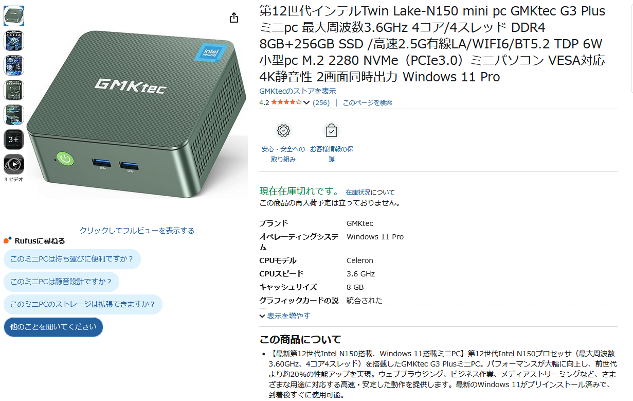 このMiniPCにUSB経由でストレージを接続してNASとして利用する事になります。内蔵SSDの容量が足りませんからね。