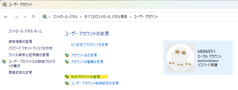 コントロールパネルでローカルなアカウントを一つ追加します。ここではアカウント k896951 を追加しました。この k896951 アカウントで共有フォルダアクセスを行う事になります。