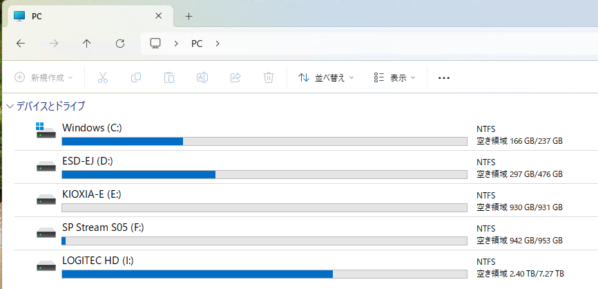USBハブを接続し、SSDをE,Fドライブとして登録し、HDDをIドライブとして登録しました。