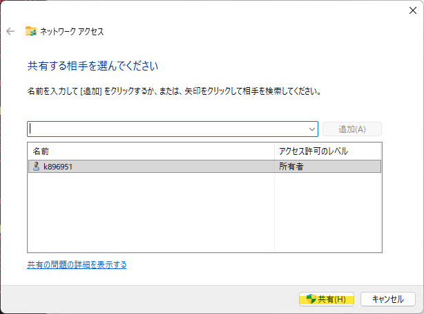 作成した共有用フォルダへ共有を指定します。
