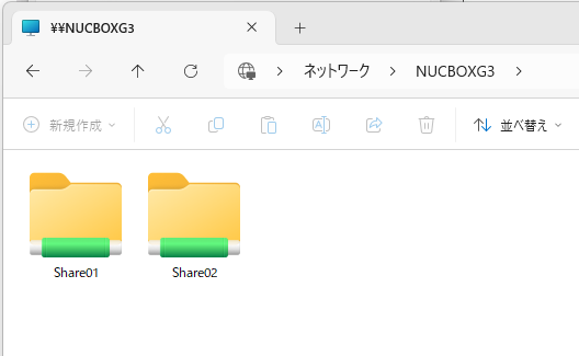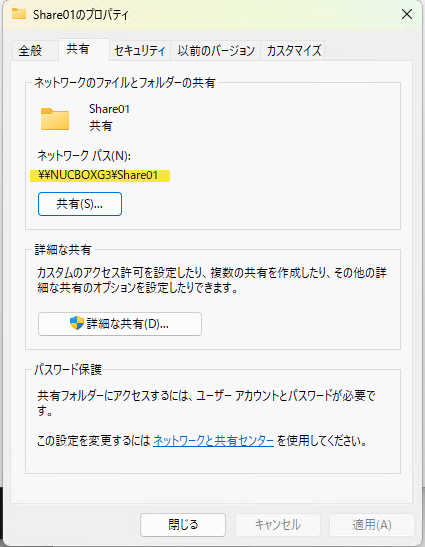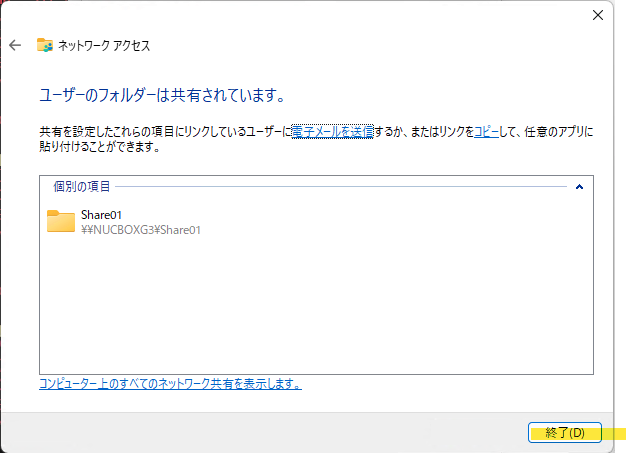 この手順で、EドライブのShare01フォルダを別のWindowsPCから \\NUCBOXG3\Share01 で参照する事が可能になりました。
