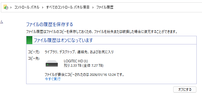 ファイル履歴を利用してバックアップとします。デフォルトだと3時間おきに変更が掛かったファイルが退避されます。