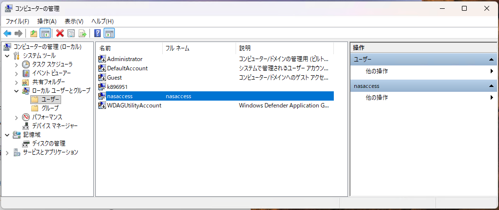 「作成」ボタンを押しても「作成しました!」的なダイアログは出ないのでそのまま「閉じる」ボタンを押しましょう。アカウント nasaccess が作成された事が分かります。デフォルトの所属グループは Users になるので、気になる人は nasaccess のプロパティを開いて「所属するグループ」タブを確認すると良いでしょう。