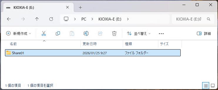 ここではEドライブとして認識されたSSDに共有用フォルダを作成します。もし認識されていなければフォーマットやらなにやらの作業を行う必要がありますがここでは説明しません面倒だし。