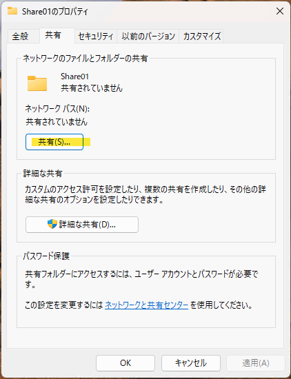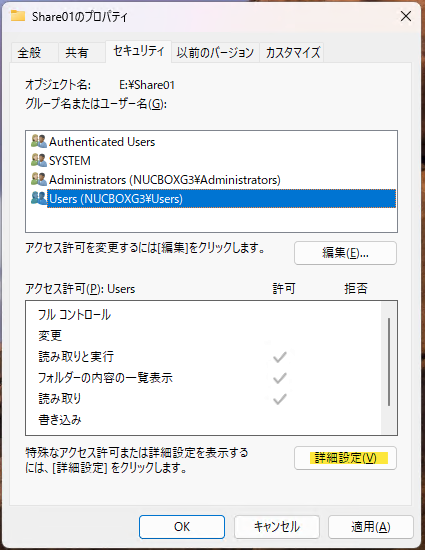 作成したらShare01のプロパティを開いて「セキュリティ」タブに切り替えて「詳細設定(V)」ボタンを押します。