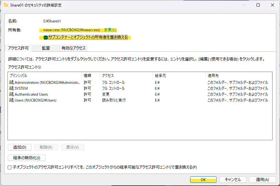 所有者を nasaccess に変更し、「サブコンテナーとオブジェクトの所有者を置き換える」にチェックを入れて、「OK」ボタンを押します。