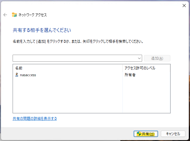 次にShare01のプロパティの「共有」タブに切り替えます。「共有(S)」ボタンを押します。共有する相手を nasaccess だけにして「共有(H)」ボタンを押します。