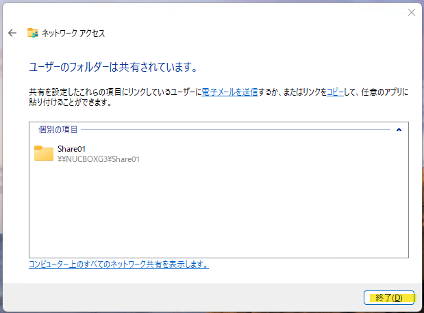 この例だと、別のWindowsPCから \\NUCBOXG3\Share01 を指定する事でMiniPCの E:\Share01 を参照する事ができるようになります。※NUCBOXG3 は MiniPCのマシン名になります。