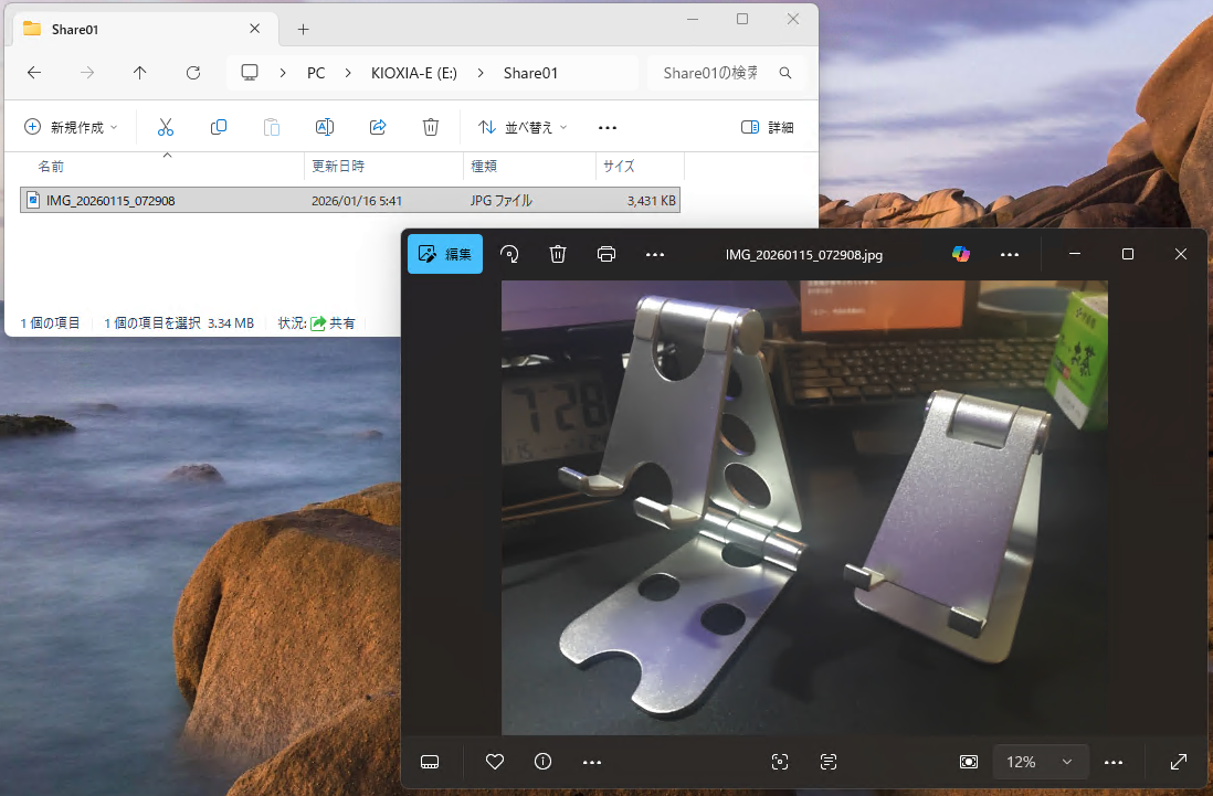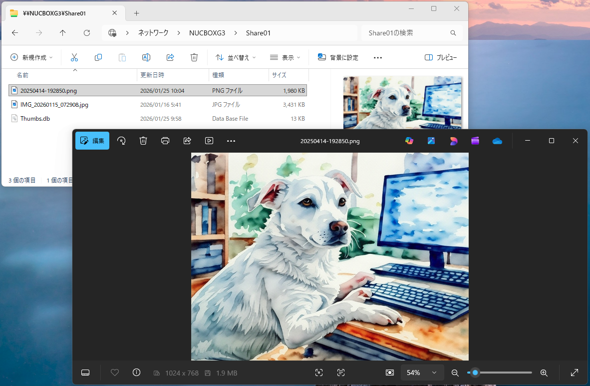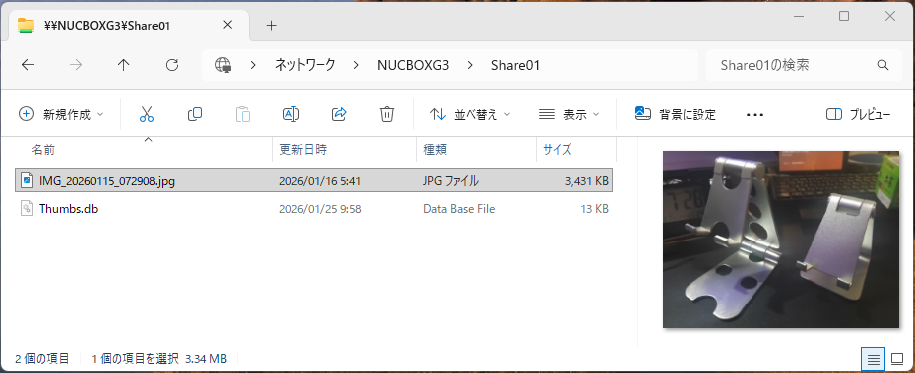 MiniPCからの共有用フォルダに別のファイルをコピーしてみると、無事にデスクトップPCから参照できました。