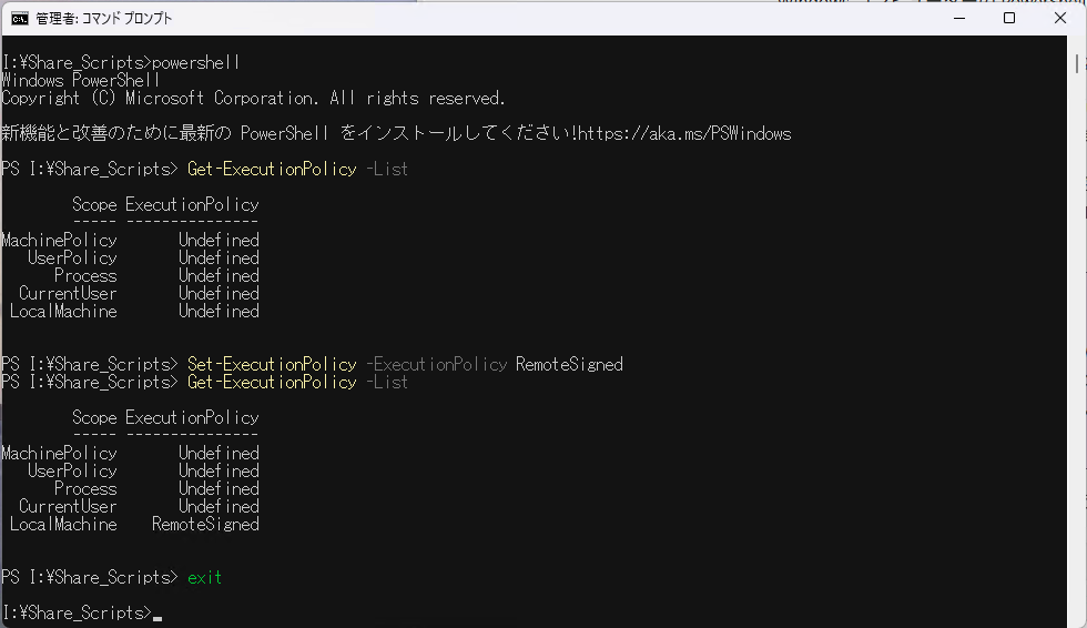 powershell Get-ExecutionPolicy -List Set-ExecutionPolicy RemoteSigned Get-ExecutionPolicy -List exit