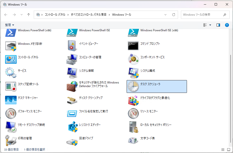 コントロールパネルから「Windowsツール」を開くとタスクスケジューラのアイコンが出てきますので起動しましょう。