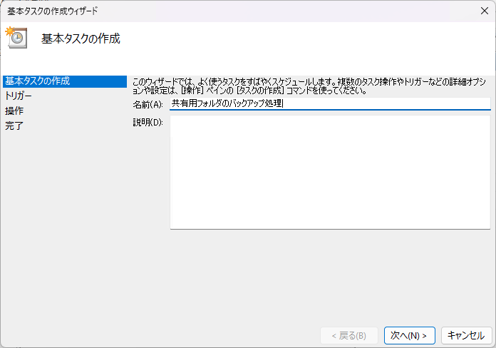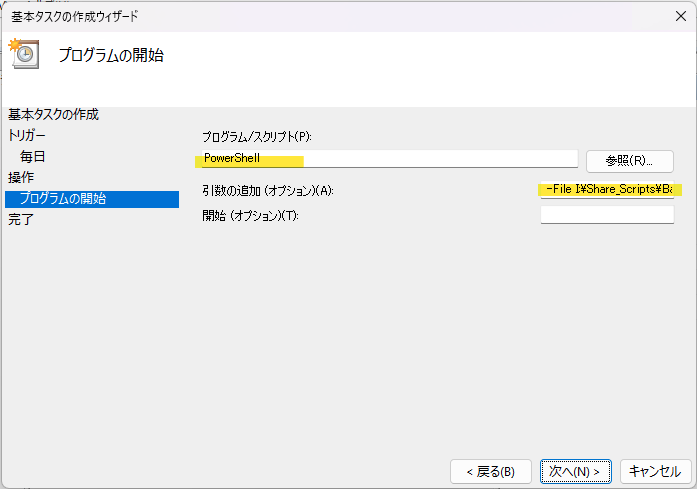 プログラムにPowerShell、引数の追加に「-File I:\Share_Scripts\Backupcmd.ps1」を書いておきます。