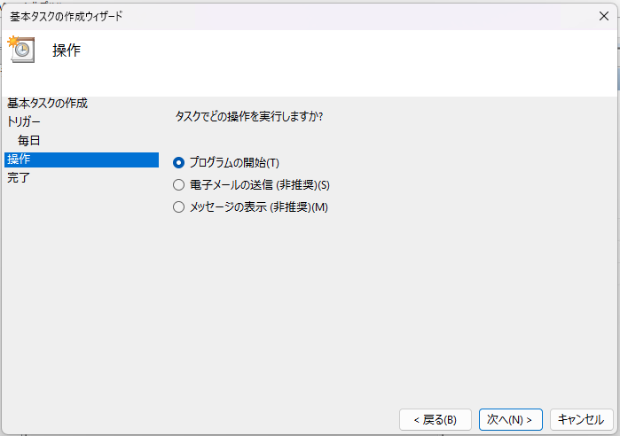 先ほど用意した Backupcmd.ps1 を実行するので「プログラムの開始」を選択します。