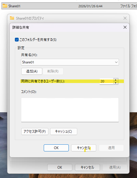 ひとつの共有フォルダに接続できるセッション数という制限がありまして最大20接続となっています。