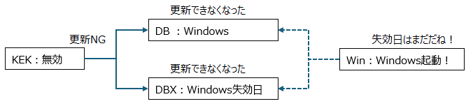 KEK無効でWindowsUpdateはDB・DBXを変更できずWindowsは起動できなくなった。